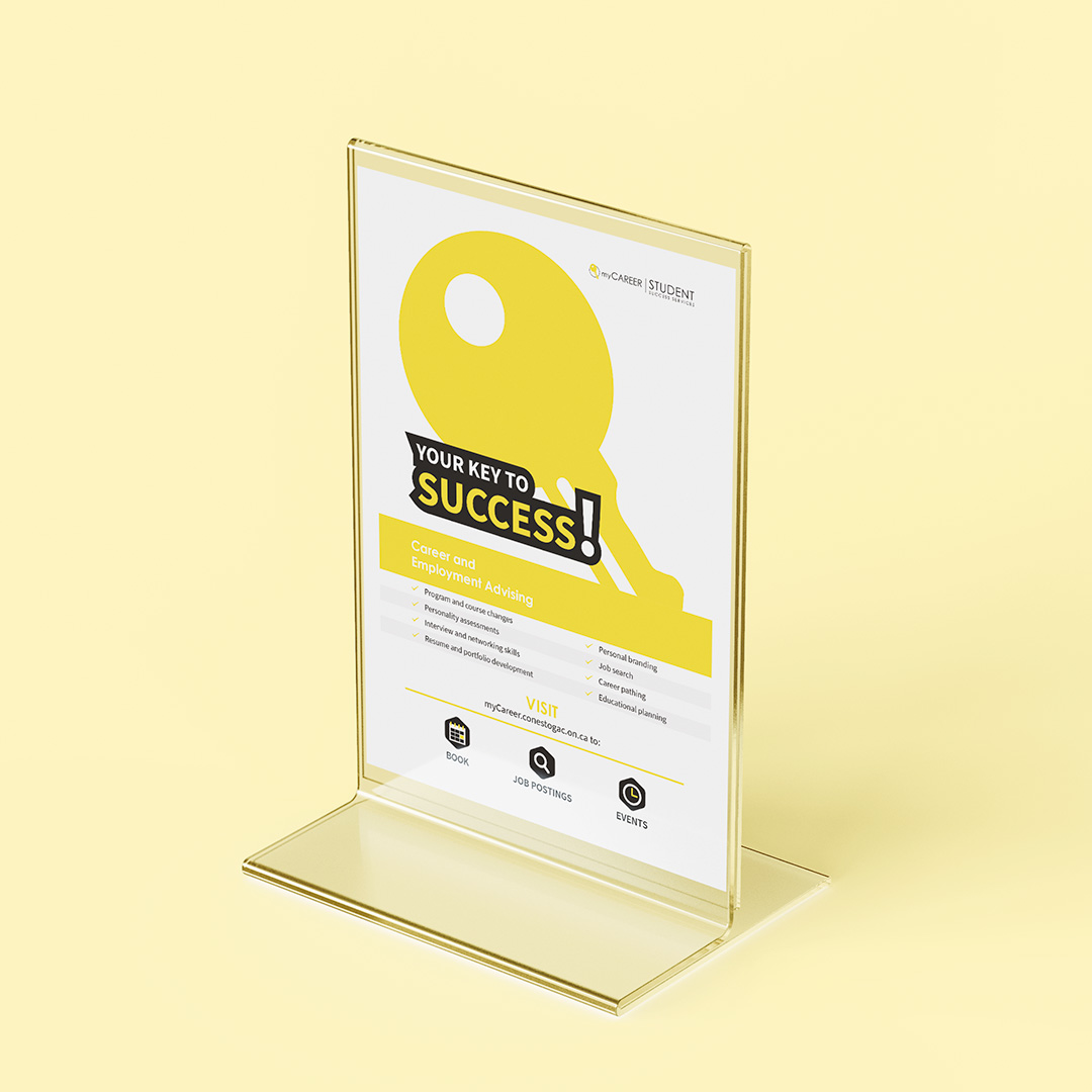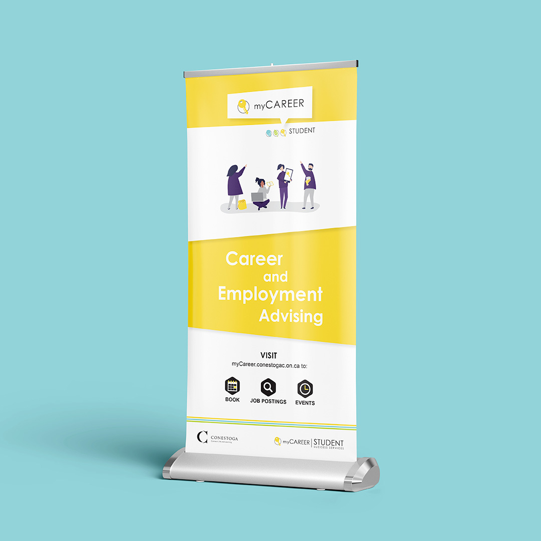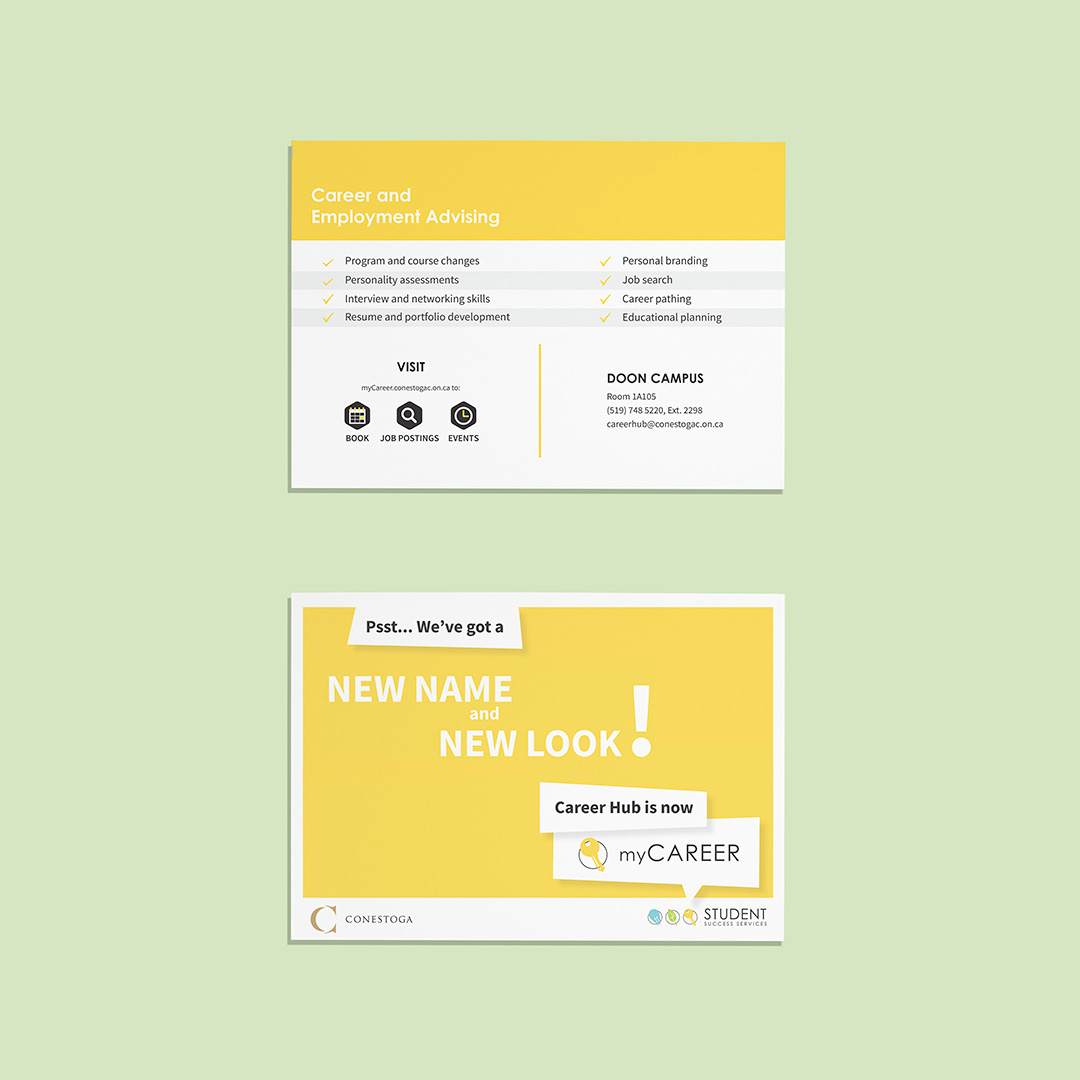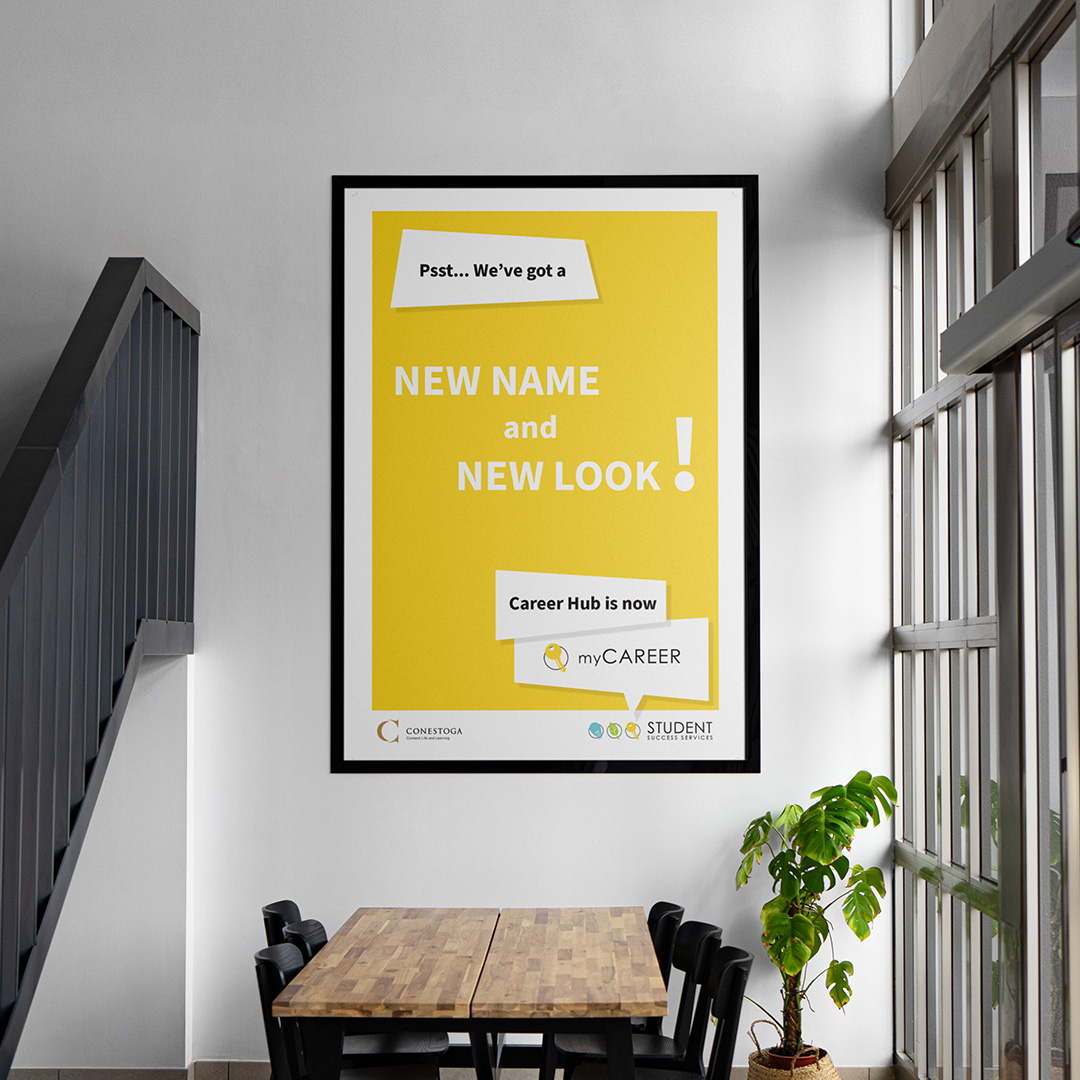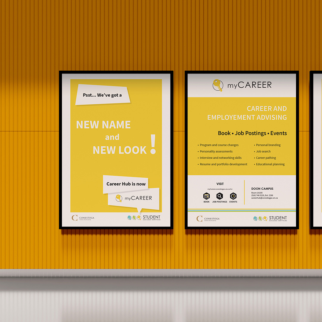 After that process, the Carrer Hub was renamed 'MyCareer' under the new Student Success Services brand and required the rebranding of all print and digital assets, presenting their diverse services to the Conestoga College community.